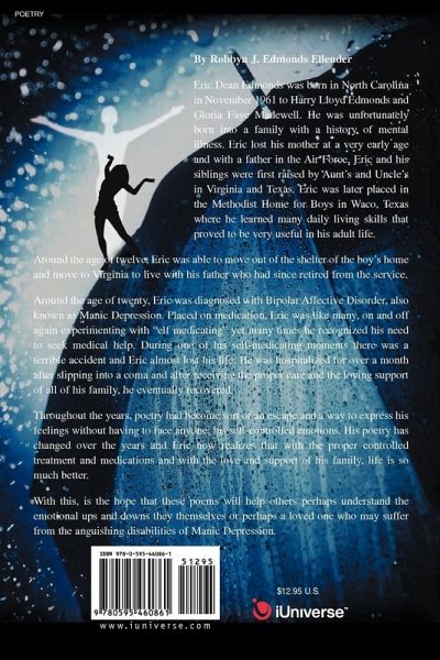 By Robbyn J. Edmonds Ellender Eric Dean Edmonds was born in North Carolina in November 1961 to Harry Lloyd Edmonds and Gloria Faye Madewell. He was unfortunately born into a family with a history of mental illness. Eric lost his mother at a very early age and with a father in the Air Force, Eric and his siblings were first raised by Aunt's and Uncle's in Virginia and Texas. Eric was later placed in the Methodist Home for Boys in Waco, Texas where he learned many daily living skills that proved to be very useful in his adult life. Around the age of twelve, Eric was able to move out of the shelter of the boy's home and move to Virginia to live with his father who had since retired from the service. Around the age of twenty, Eric was diagnosed with Bipolar Affective Disorder, also known as Manic Depression. Placed on medication, Eric was like many, on and off again experimenting with "elf medicating" yet many times he recognized his need to seek medical help. During one of his self-medicating moments there was a terrible accident and Eric almost lost his life. He was hospitalized for over a month after slipping into a coma and after receiving the proper care and the loving support of all of his family, he eventually recovered. Throughout the years, poetry had become sort of an escape and a way to express his feelings without having to face anyone; his self-controlled emotions. His poetry has changed over the years and Eric now realizes that with the proper controlled treatment and medications and with the love and support of his family, life is so much better. With this, is the hope that these poems will help others perhaps understand the emotional ups and downs they themselves or perhaps a loved one who may suffer from the anguishing disabilities of Manic Depression.