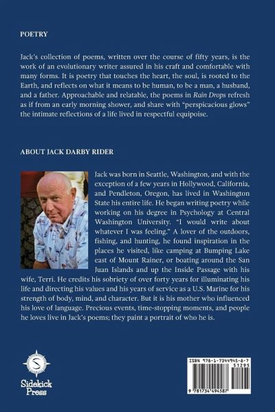 Jack Rider's collection of poems, written over the course of fifty years, is the work of an evolutionary writer assured in his craft and comfortable with many forms. It is poetry that touches the heart, the soul, is rooted to the Earth, and reflects on what it means to be human, to be a man, a husband, and a father. Approachable and relatable, the poems in Rain Drops refresh as if from an early morning shower, and share with "perspicacious glows" the intimate reflections of a life lived in respectful equipoise.
