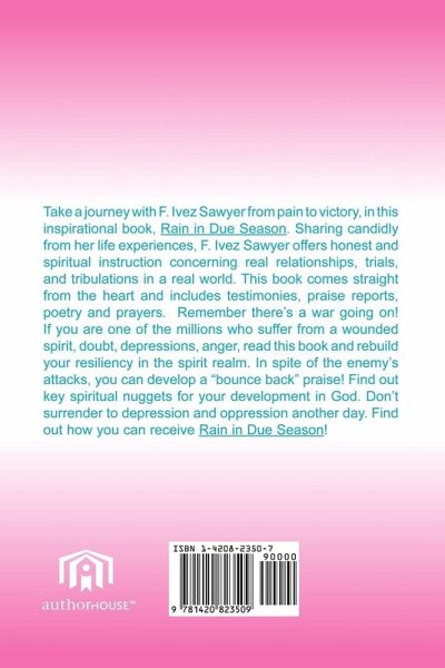 Take a journey with F. Ivez Sawyer from pain to victory, in this inspirational book, Rain in Due Season. Sharing candidly from her life experiences, F. Ivez Sawyer offers honest and spiritual instruction concerning real relationships, trials, and tribulations in a real world. This book comes straight from the heart and includes testimonies, praise reports, poetry and prayers. Remember there's a war going on! If you are one of the millions who suffer from a wounded spirit, doubt, depressions, anger, read this book and rebuild your resiliency in the spirit realm. In spite of the enemy's attacks, you can develop a "bounce back" praise! Find out key spiritual nuggets for your development in God. Don't surrender to depression and oppression another day. Find out how you can receive Rain in Due Season!