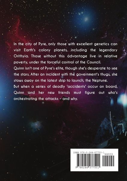 In the city of Pyre, only those with excellent genetics can visit Earth's colony planets, including the legendary Orithyia. Those without this advantage live in relative poverty, under the forceful control of the Council. Quinn isn't one of Pyre's elite, though she's desperate to see the stars. After an incident with the government's thugs, she stows away on the latest ship to launch, the Neptune. But when a series of deadly 'accident's occur on board, Quinn and her new friends must figure out who's orchestrating the attacks - and why.