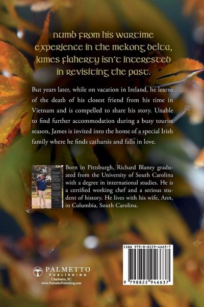 A Vietnam veteran finds catharsis and love while writing an unplanned memoir in Ireland. After his final round of golf while on vacation in Ireland, American businessman James Flaherty shares a drink with an American expat in the golf club. After learning that James fought in Vietnam, she suggests he visit the Vietnam Traveling Wall that has just arrived at a manor home nearby. Arriving at the wall, James scans the list of fallen Irish soldiers and among them, one name stands out. Ardal Shea. Fighting tears, James is shocked to discover that his closest comrade was killed in combat. As the memories of his time with Ardal in the Mekong Delta come flooding back, James realizes he can't leave Ireland yet, not until he writes down their story and gives it to Ardal's family. Having never faced his ghosts from Vietnam, he finally understands that the only way to move forward is to go back. Instead of making his way to the airport as he intended, he ends up back at the inn where he started the day, only to discover the inn no longer has availability. Sympathetic to his plight, the innkeepers offer up a spare room in their home. Through the kindness and warmth of the Bohan family, James begins to process his wartime trauma, and in doing so, falls in love. Author Richard Blaney's poignant narrative weaves between the past and present, contrasting the trauma of war to the joy of unexpected love. Celebrating the connection between the United States and Ireland, Rain on the Leaves will resonate with adult fans of romance and war novels.