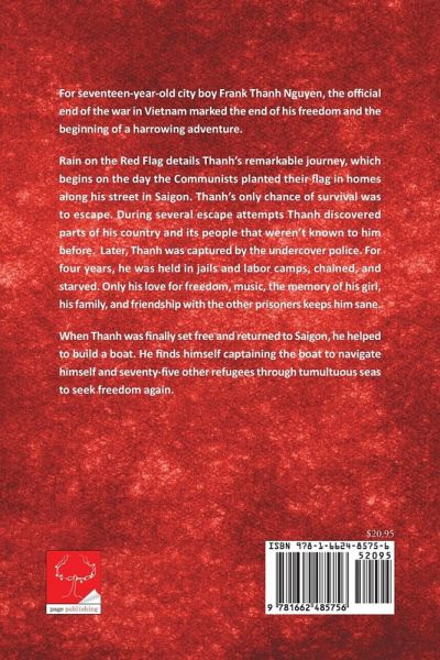 For seventeen-year-old city boy Frank Thanh Nguyen, the official end of the war in Vietnam marked the end of his freedom and the beginning of a harrowing adventure. Rain on the Red Flag details Thanh's remarkable journey, which begins on the day the Communists planted their flag in homes along his street in Saigon. Thanh's only chance of survival was to escape. During several escape attempts Thanh discovered parts of his country and its people that weren't known to him before. Later, Thanh was captured by the undercover police. For four years, he was held in jails and labor camps, chained, and starved. Only his love for freedom, music, the memory of his girl, his family, and friendship with the other prisoners keeps him sane. When Thanh was finally set free and returned to Saigon, he helped to build a boat. He finds himself captaining the boat to navigate himself and seventy-five other refugees through tumultuous seas to seek freedom again.