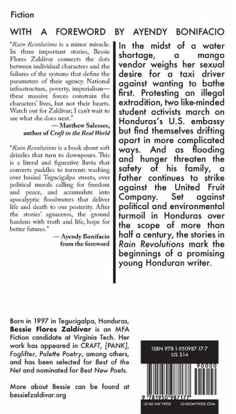 In the midst of a water shortage, a mango vendor weighs her sexual desire for a taxi driver against wanting to bathe first. Protesting an illegal extradition, two like-minded student activists march on Honduras's U.S. embassy but find themselves drifting apart in more complicated ways. And as flooding and hunger threaten the safety of his family, a father continues to strike against the United Fruit Company. Set against political and environmental turmoil in Honduras over the scope of more than half a century, the stories in Rain Revolutions mark the beginnings of a promising young Honduran writer. "Rain Revolutions is a minor miracle. In three important stories, Bessie Flores Zaldívar connects the dots between individual characters and the failures of the systems that define the parameters of their agency. National infrastructure, poverty, imperialism-these massive forces constrain the characters' lives, but not their hearts. Watch out for Zaldívar; I can't wait to see what she does next." - Matthew Salesses, author of Craft in the Real World "Rain Revolutions is a book about soft drizzles that turn to downpours. This is a literal and figurative lluvia that converts puddles to torrents washing over busied Tegucigalpa streets, over political murals calling for freedom and peace, and accumulate into apocalyptic floodwaters that deliver life and death to our posterity. After the stories' aguaceros, the ground hardens with truth and life, hope for better futures." - Ayendy Bonifacio from the foreword