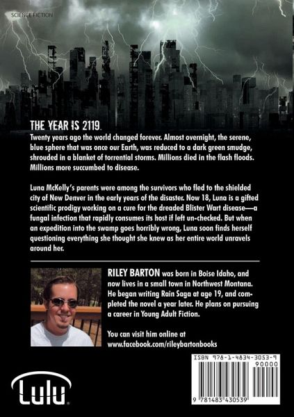 The year is 2119. Twenty years ago the world changed forever. Almost overnight, the serene, blue sphere that was once our Earth, was reduced to a dark green smudge, shrouded in a blanket of torrential storms. Millions died in the flash floods. Millions more succumbed to disease. Luna McKelly's parents were among the survivors who fled to the shielded city of New Denver in the early years of the disaster. Now 18, Luna is a gifted scientific prodigy working on a cure for the dreaded Blister Wart disease-a fungal infection that rapidly consumes its host if left un-checked. But when an expedition into the swamp goes horribly wrong, Luna soon finds herself questioning everything she thought she knew as her entire world unravels around her.