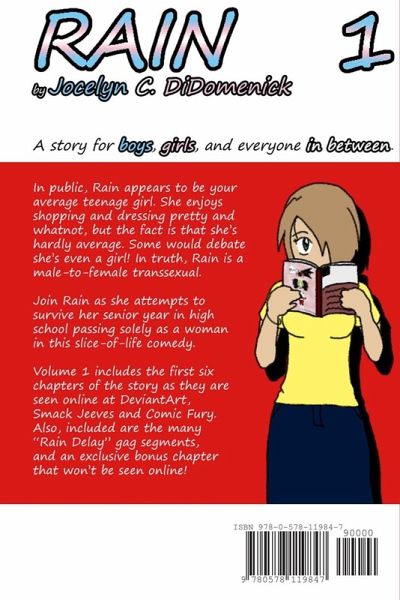 In public, Rain appears to be your average teenage girl. She enjoys shopping and dressing pretty and whatnot, but the fact is that she's hardly average. Some would debate she's even a girl! In truth, Rain is a male-to-female transsexual. Join Rain as she attempts to survive her senior year in high school passing solely as a woman in this slice-of-life comedy. Volume 1 includes the first six chapters of the story as they are seen online at DeviantArt, SmackJeeves and Comic Fury. Also included are the many ""Rain Delay"" gag segments and an exclusive bonus chapter that won't be seen online.