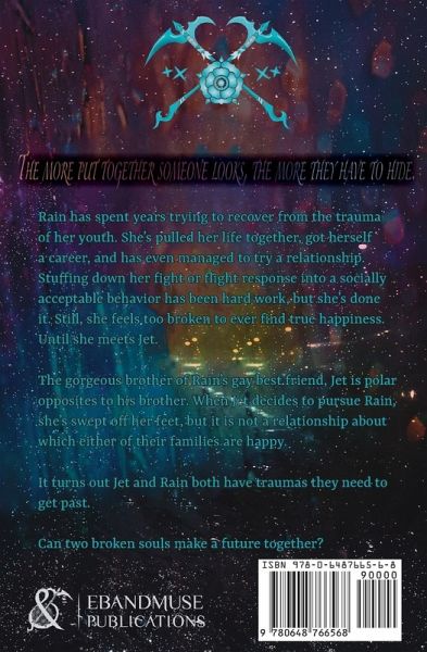 The more put together someone looks, the more they have to hide. Rain has spent years trying to recover from the trauma of her youth. She's pulled her life together, got herself a career, and has even managed to try a relationship. Stuffing down her fight or flight response into a socially acceptable behavior has been hard work, but she's done it. Still, she feels too broken to ever find true happiness. Until she meets Jet. The gorgeous brother of Rain's gay best friend, Jet is polar opposites to his brother. When Jet decides to pursue Rain, she's swept off her feet, but it is not a relationship about which either of their families are happy. It turns out Jet and Rain both have traumas they need to get past. Can two broken souls make a future together?