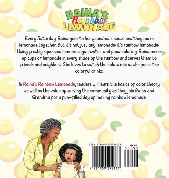 Every Saturday, Raina goes to her grandma's house and they make lemonade together. But it's not just any lemonade; it's rainbow lemonade! Using freshly squeezed lemons, sugar, water, and food coloring, Raina mixes up cups of lemonade in every shade of the rainbow and serves them to friends and neighbors. She loves to watch the colors mix as she pours the colorful drinks. In Raina's Rainbow Lemonade, readers will learn the basics of color theory as well as the value of serving the community as they join Raina and Grandma for a fun-filled day of making rainbow lemonade. ¿¿¿¿ ¿¿¿¿ ¿¿¿¿ ¿¿¿¿