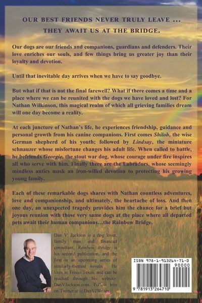 OUR BEST FRIENDS NEVER TRULY LEAVE … THEY AWAIT US AT THE BRIDGE. Our dogs are our friends and companions, guardians and defenders. Their love enriches our souls, and few things bring us greater joy than their loyalty and devotion. Until that inevitable day arrives when we have to say goodbye. But what if that is not the final farewell? What if there comes a time and a place where we can be reunited with the dogs we have loved and lost? For Nathan Wilkinson, this magical realm of which all grieving families dream will one day become a reality. At each juncture of Nathan’s life, he experiences friendship, guidance and personal growth from his canine companions. First comes Shiloh, the wise German shepherd of his youth; followed by Lindsay, the miniature schnauzer whose misfortune changes his adult life. When called to battle, he befriends Georgie, the stout war dog, whose courage under fire inspires all who serve with him. Finally there are the Labradors, whose seemingly mindless antics mask an iron-willed devotion to protecting his growing young family. Each of these remarkable dogs shares with Nathan countless adventures, love and companionship, and ultimately, the heartache of loss. And then one day, an unexpected tragedy provides him the chance for a brief but joyous reunion with those very same dogs at the place where all departed pets await their human companions…the Rainbow Bridge.
