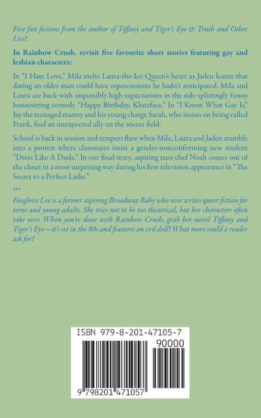 Five fun fictions from the author of Tiffany and Tiger's Eye & Truth and Other Lies! In Rainbow Crush, revisit five favourite short stories featuring gay and lesbian characters: In "I Hate Love," Mila melts Laura-the-Ice-Queen's heart as Jaden learns that dating an older man could have repercussions he hadn't anticipated. Mila and Laura are back with impossibly high expectations in the side-splittingly funny housesitting comedy "Happy Birthday, Klutzface." In "I Know What Gay Is," Jay the teenaged manny and his young charge Sarah, who insists on being called Frank, find an unexpected ally on the soccer field. School is back in session and tempers flare when Mila, Laura and Jaden stumble into a protest where classmates insist a gender-nonconforming new student "Dress Like A Dude." In our final story, aspiring teen chef Noah comes out of the closet in a most surprising way during his first television appearance in "The Secret to a Perfect Latke." *** Foxglove Lee is a former aspiring Broadway Baby who now writes queer fiction for teens and young adults. She tries not to be too theatrical, but her characters often take over. When you're done with Rainbow Crush, grab her novel Tiffany and Tiger's Eye—it's set in the 80s and features an evil doll! What more could a reader ask for?