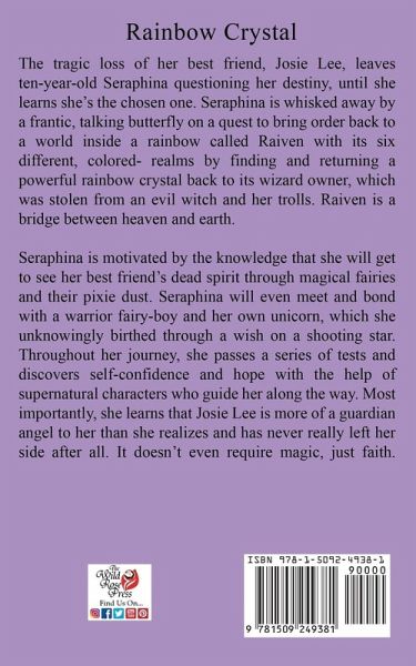 The tragic loss of her best friend, Josie Lee, leaves ten-year-old Seraphina questioning her destiny, until she learns she's the chosen one. Seraphina is whisked away by a frantic, talking butterfly on a quest to bring order back to a world inside a rainbow called Raiven with its six different, colored- realms by finding and returning a powerful rainbow crystal back to its wizard owner, which was stolen from an evil witch and her trolls. Raiven is a bridge between heaven and earth; Seraphina is motivated by the knowledge that she will get to see her best friend's dead spirit through magical fairies and their pixie dust. Seraphina will even meet and bond with a warrior fairy-boy and her own unicorn, which she unknowingly birthed through a wish on a shooting star. Throughout her journey, she passes a series of tests and discovers self-confidence and hope with the help of supernatural characters who guide her along the way. Most importantly, she learns that Josie Lee is more of a guardian angel to her than she realizes and has never really left her side after all. It doesn't even require magic, just faith.