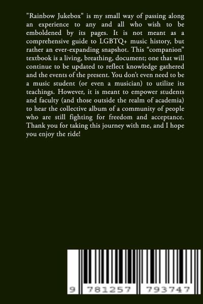"Rainbow Jukebox" is my small way of passing along an experience to any and all who wish to be emboldened by its pages. It is not meant as a comprehensive guide to LGBTQ+ music history, but rather an ever-expanding snapshot. This "companion" textbook for LGBTQ+ Perspectives in American Music is a living, breathing, document; one that will continue to be updated to reflect knowledge gathered and the events of the present. You don't even need to be a music student (or even a musician) to utilize its teachings. However, it is meant to empower students and faculty (and those outside the realm of…mehr