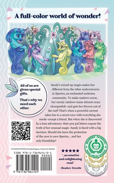 Encourage young chapter book readers through magical full-color illustrations in the award-winning Rainbow of Spectra. Sandy's mixed-up magic makes her different from the other seahorsicorns in Spectra, an enchanted undersea community. To make matters worse, her unruly rainbow mane attracts scary chomperfish-and gets her thrown out of the reef! That's when a powerful current takes her to a secret cave with everything she needs-except a friend. But when she is discovered by a lone adventurer, their pen pal letters expose the truth of her unusual magic. Sandy is faced with a big decision. Should she leave the protection of the cave to save Spectra... and her only friendship? Readers' Favorite Illustration Award & Honorable Mention Winner