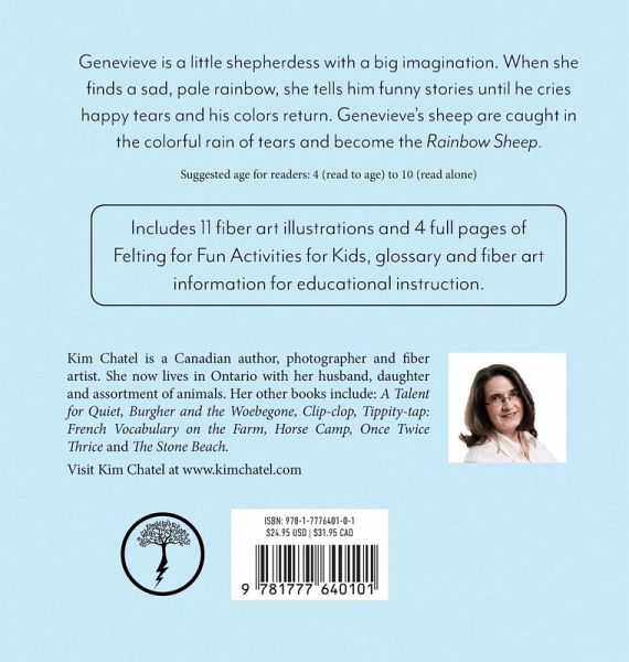 Genevieve is a little shepherdess with a big imagination. When she finds a sad, pale rainbow, she tells him funny stories until he cries happy tears and his colors return. Genevieve's sheep are caught in the colorful rain of tears and become the Rainbow Sheep. Suggested age for readers: 4 (read to age) to 10 (read alone) Includes 11 fiber art illustrations and 4 full pages of Felting for Fun Activities for Kids, glossary and fiber art information for educational instruction.