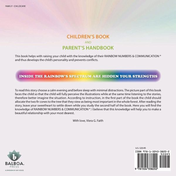 Children's book and parent's handbook This book helps with raising your child with the knowledge of their RAINBOW NUMBERS & COMMUNICATION ® and thus develops the child's personality and prevents conflicts. To read this story choose a calm evening and before sleep with minimal distractions. The picture part of this book faces the child so that the child will fully perceive the illustrations while at the same time listening to the stories, therefore better imagine the situation. According to instruction, in the first part of the book the child should allocate the two fir cones to the tree that they view as being most important in the whole forest. After reading the story, leave your sweetheart to settle down while you study the second half of the book. Here you will find the knowledge of RAINBOW NUMBERS & COMMUNICATION ®. I believe that this knowledge will help you to make a beautiful relationship with your most dearest. With love, Viera G. Faith