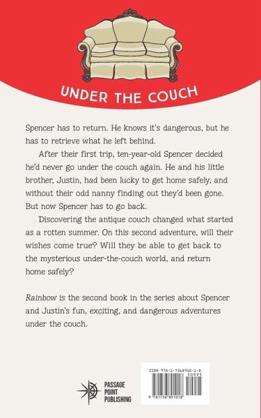 Spencer swore he'd never go back. But the pull was too strong to resist. The memory of the under-the-couch world still sent shivers down ten-year-old Spencer's spine. He had vowed never to return to that creepy place, but the thought of leaving behind his grandmother's precious gift was more terrifying than any danger he might face. Spencer and his little brother, Justin, were lucky to have escaped the under-the-couch world after their first adventure. The memory of the terrifying ordeal still haunts Spencer. Now, the two brothers are about to embark on another perilous journey. But how can they possibly navigate the mysterious under-the-couch world again, especially when they don't even know how they got there in the first place? Discovering the secrets of the antique couch has turned the worst summer ever into an unforgettable adventure. On this second journey, the brothers are transported to a place where wishes come true. But they soon realize that the under-the-couch world is filled with as much danger as magic. Can they find their way back home safely ... and before the nanny notices they are missing? Rainbow is the second book in a children's fantasy series about two brothers who discover a mysterious world beneath their antique couch. Join them on another thrilling adventure filled with fun, danger, and important lessons. The new Under the Couch fantasy series of 12 books explores sibling relationships, overcoming challenges, facing fears, and learning valuable life lessons through experiences. Read the books in order, starting with book 1, Hide and Seek, and unravel the secrets of the mysterious under-the-couch world!