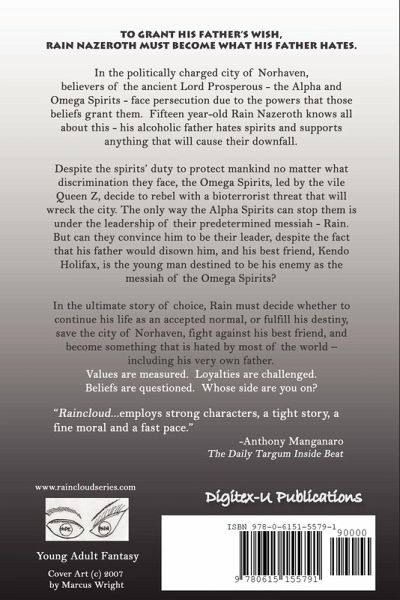 In the politically charged city of Norhaven, believers of the ancient Lord Prosperous, the Alpha and Omega Spirits, face persecution due to the powers that those beliefs grant them. Fifteen year old Rain Nazeroth knows all about this - his alcoholic father hates spirits and supports anything that will cause their downfall. Despite the spirits' duty to protect mankind no matter what discrimination they face, the Omega Spirits, led by the vile Queen Z, decide to rebel with a bioterrorist threat that will wreck the city. The only way the Alpha Spirits can stop them is under the leadership of their predetermined messiah - Rain. But can they convince him to be their leader, despite the fact that his father would disown him, and his best friend, Kendo Holifax, is the young man destined to be his enemy as the messiah of the Omega Spirits? A young adult fantasy with a deep perspective on social struggle, Raincloud will challenge your perspective, and free your mind at will.