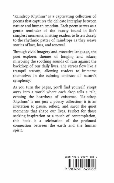 "Raindrop Rhythms" is a captivating collection of poems that captures the delicate interplay between nature and human emotion. Each poem serves as a gentle reminder of the beauty found in life's simplest moments, inviting readers to listen closely to the rhythmic patter of raindrops as they weave stories of love, loss, and renewal. Through vivid imagery and evocative language, the poet explores themes of longing and solace, mirroring the soothing sounds of rain against the backdrop of our daily lives. The verses flow like a tranquil stream, allowing readers to immerse themselves in the calming embrace of nature's symphony. As you turn the pages, you'll find yourself swept away into a world where each drop tells a tale, echoing the heartbeat of existence. "Raindrop Rhythms" is not just a poetry collection; it is an invitation to pause, reflect, and savor the quiet moments that shape our lives. Perfect for those seeking inspiration or a touch of contemplation, this book is a celebration of the profound connection between the earth and the human spirit.