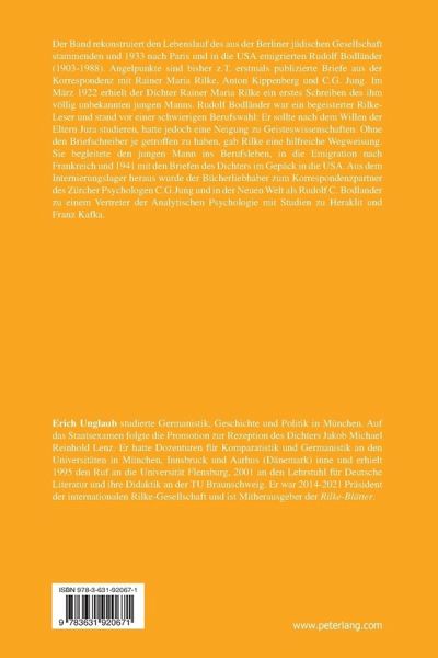 Der Band rekonstruiert den Lebenslauf des aus der Berliner jüdischen Gesellschaft stammenden und 1933 nach Paris und in die USA emigrierten Rudolf Bodländer (1903-1988). Angelpunkte sind bisher z.T. erstmals publizierte Briefe aus der Korrespondenz mit Rainer Maria Rilke, Anton Kippenberg und C.G. Jung. Im März 1922 erhielt der Dichter Rainer Maria Rilke ein erstes Schreiben des ihm völlig unbekannten jungen Manns. Rudolf Bodländer war ein begeisterter Rilke-Leser und stand vor einer schwierigen Berufswahl: Er sollte nach dem Willen der Eltern Jura studieren, hatte jedoch eine Neigung zu Geisteswissenschaften. Ohne den Briefschreiber je getroffen zu haben, gab Rilke eine hilfreiche Wegweisung. Sie begleitete den jungen Mann ins Berufsleben, in die Emigration nach Frankreich und 1941 mit den Briefen des Dichters im Gepäck in die USA. Aus dem Internierungslager heraus wurde der Bücherliebhaber zum Korrespondenzpartner des Zürcher Psychologen C.G.Jung und in der Neuen Welt als Rudolf C. Bodlander zu einem Vertreter der Analytischen Psychologie mit Studien zu Heraklit und Franz Kafka.