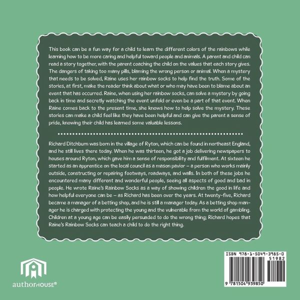 This book can be a fun way for a child to learn the different colors of the rainbows while learning how to be more caring and helpful toward people and animals. A parent and child can read a story together, with the parent coaching the child on the values that each story gives. The dangers of taking too many pills, blaming the wrong person or animal. When a mystery that needs to be solved, Raine uses her rainbow socks to help find the truth. Some of the stories, at first, make the reader think about what or who may have been to blame about an event that has occurred. Raine, when using her rainbow socks, can solve a mystery by going back in time and secretly watching the event unfold or even be a part of that event. When Raine comes back to the present time, she knows how to help solve the mystery. These stories can make a child feel like they have been helpful and can give the parent a sense of pride, knowing their child has learned some valuable lessons.