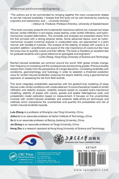 Introduction. Infiltration and Seepage Analysis in Soil Slopes. Stability Analysis of Slope under Rainfall Infiltration Based on Limit Equilibrium. Coupled Hydromechanical Analysis for Unsaturated Soil Slope. Stability of Soil Slope with Cracks. Stability Analysis of Colluvium Slopes upon a Rainstorm. Reliability Analysis of Slope under Rainfall. Probabilistic Assessment of Random Heterogeneous Soil Slopes. Probabilistic Model Calibration.