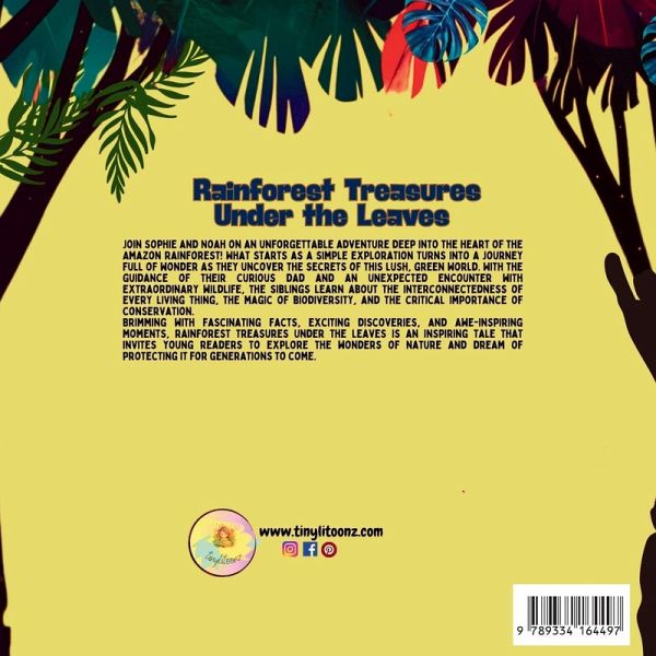 Step into the heart of the Rainforest with Sophie and Noah on an unforgettable adventure of discovery, wonder, and environmental awareness! In Rainforest Treasures Under the Leaves, young readers are invited to join Sophie and Noah, two curious siblings, as they explore the mysteries of one of Earth's most vibrant ecosystems-the rainforest. Guided by their father, Sophie and Noah learn to see beyond the lush green canopy and witness the beauty, complexity, and fragility hidden beneath the leaves. As they journey deeper into the forest, they encounter breathtaking plants, colorful creatures like Scarlet Macaws, and learn how each part of the rainforest, from towering trees to buzzing insects, plays an essential role in maintaining the balance of life. Through captivating facts, they come to understand the delicate connections in the ecosystem, how animals adapt to their environment, and the important role rainforests play in providing oxygen, regulating the climate, and sustaining biodiversity. But with every adventure comes responsibility. Alongside their father, Sophie and Noah uncover the real challenges rainforests face today-deforestation, habitat loss, and the need for conservation. They learn that protecting the rainforest isn't just the job of scientists and explorers; it's something everyone can contribute to. With hands-on activities, "Did You Know?" rainforest facts, and engaging illustrations, Rainforest Treasures Under the Leaves is a captivating journey into the wonders of nature, sparking curiosity and a lifelong commitment to protecting our planet. Ideal for young explorers aged 6-12, this book is perfect for families, educators, and budding environmentalists looking to inspire a love for nature and a commitment to making a difference.