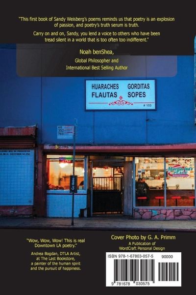 S.A. Weisberg writes a rainstorm flood in a celebration of baseball, spirituality and hope. A resident on Spring Street, Downtown L.A., he greets every morning and every person he meets with the joy of "...the soft velvet touch of a baby's cheek, the cry of a lobster boiling in a pot of bubbly water, a woman's stretching sigh." "This first book of Sandy Weisberg's poems reminds us that poetry is an explosion of passion, and poetry's truth serum is truth." -Noah benShea