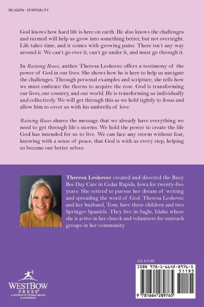 God knows how hard life is here on earth. He also knows the challenges and turmoil will help us grow into something better, but not overnight. Life takes time, and it comes with growing pains. There isn't any way around it. We can't go over it, can't go under it, and must go through it. In Raining Roses, author Theresa Leskovec offers a testimony of the power of God in our lives. She shows how he is here to help us navigate the challenges. Through personal examples and scripture, she tells how we must embrace the thorns to acquire the rose. God is transforming our lives, our country, and our world. He is transforming us individually and collectively. We will get through this as we hold tightly to Jesus and allow him to cover us with his umbrella of love. Raining Roses shares the message that we already have everything we need to get through life's storms. We hold the power to create the life God has intended for us to live. We can face any storm without fear, knowing with a sense of peace, that God is with us every step, helping us become our better selves.