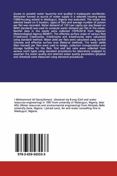 Access to potable water (quantity and quality) is inadequate worldwide. Rainwater harvest as source of water supply in a selected housing estate (1000-housing estate) in Maiduguri, Nigeria was evaluated. The estate was selected based on it location, types of flats and average number of person per flat was recorded. Water demand of 120 l per capita per day (based on WHO standard) was used to compute water demand per flat in the estate. Rainfall data in the estate were collected (1979-2013) from Nigerian Meteorological Agency (NIMET). The effective surface areas of various flats (1-bedroom 2-bedrooms, 3-bedrooms and 4-bedrooms) were calculated using standard method. Water yield per flats were calculated using rainfall intensity and effective surface area (Rational method). The water yields (Rain harvest) per flats were used in design, collection transportation and storage facilities for the flats. First and last rains were collected from various roofs types using standard procedures for laboratory analyzed to ascertain the water quality and selected water quality parameters (physical and chemical) were measured using standard procedures.