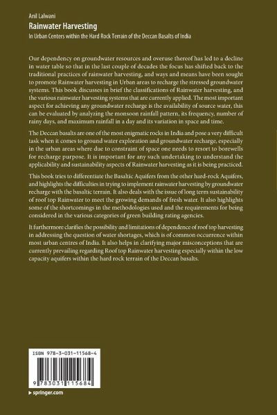 This book tries to differentiate the Basaltic Aquifers from the other hard-rock Aquifers, and highlights the difficulties in trying to implement rainwater harvesting by groundwater recharge with the basaltic terrain. It also deals with the issue of long term sustainability of roof top Rainwater to meet the growing demands of fresh water. It also highlights some of the shortcomings in the methodologies used and the requirements for being considered in the various categories of green building rating agencies.