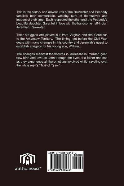 This is the history and adventures of the Rainwater and Peabody families; both comfortable, wealthy, sure of themselves and leaders of their time. Each respected the other until the Peabody's beautiful daughter, Sara, fell in love with the handsome half-Indian Jeremiah Rainwater. Their struggles are played out from Virginia and the Carolinas to the Arkansaw Territory. The timing, set before the Civil War, deals with many changes in this country and Jeremiah's quest to establish a legacy for his young son, William. The changes manifest themselves in lawlessness, murder, grief, new birth and love as seen through the eyes of a father and son as they experience all the emotions involved while traveling over the white man's "Trail of Tears".