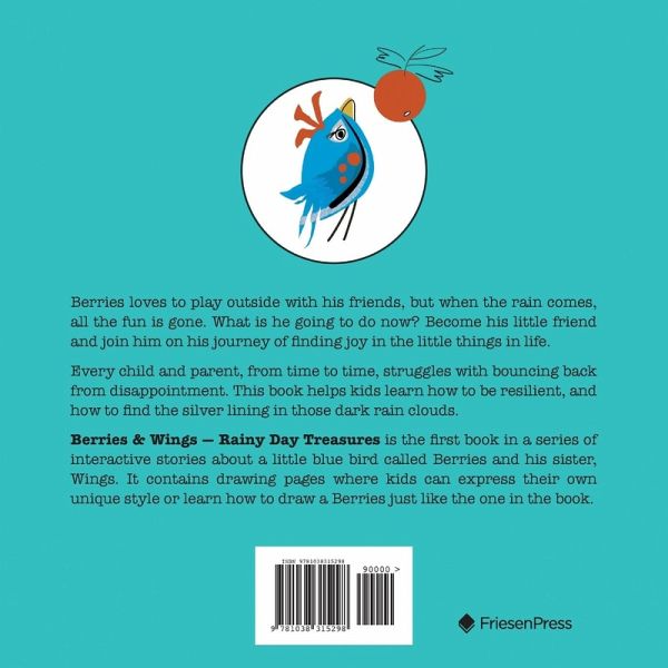 Berries loves to play outside with his friends, but when the rain comes, all the fun is gone. What is he going to do now? Become his little friend and join him on his journey of finding joy in the little things in life. Every child and parent, from time to time, struggles with bouncing back from disappointment. This book helps kids learn how to be resilient, and how to find the silver lining in those dark rain clouds. Berries & Wings - Rainy Day Treasures is the first book in a series of interactive stories about a little blue bird called Berries and his sister, Wings. It contains drawing pages where kids can express their own unique style or learn how to draw a Berries just like the one in the book.