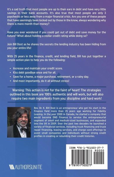 It's a sad truth that most people are up to their ears in debt and have very little savings in their bank accounts. It's also true that most people are only three paychecks or less away from a major financial crisis. Are you one of these people who have seemingly been locked out by those in the know, always wondering why there is more month than money? Have you ever wondered if you could get out of debt and save money for the future? What about holding a stellar credit rating while doing so? Join Bill Dost as he shares the secrets the lending industry has been hiding from you your entire life! With 25 years in the finance, credit, and lending field, Bill has put together a simple action plan to help you do the following: Increase and maintain your credit score. Kiss debt goodbye once and for all. Save for a home, a major purchase, retirement, or a rainy day. And most importantly, do it all without stress! Warning: This book is not for the faint of heart! The strategies outlined in this book are 100% authentic and will work, but will also require two main ingredients from you: discipline and hard work!