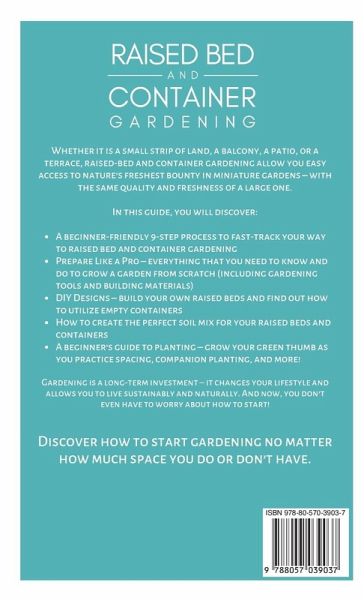 Master your first gardening experience - even with limited space - by following these 9 easy steps! Gardening has long been an extremely rewarding practice - giving you the power to grow fruits, vegetables, and herbs for your kitchen and your dinner table. However, it can require a lot of time, patience, and, most importantly, space. Space is a big issue, especially if you live in an urban area or don't have access to the sprawling, open ground. And that's where raised beds and containers come in! These compact mini-gardening methods allow you to plant and maintain a garden easily and are flexible enough to let you grow whatever you want. Whether it is a small strip of land, a balcony, a patio, or a terrace, raised bed and container gardening allow you easy access to nature's freshest bounty in miniature gardens - with the same quality and freshness of a large one. So, where do you start? Simple: just follow these 9 steps! In Raised Bed and Container Gardening, you will discover:A beginner-friendly 9-step process to fast-track your way to raised bed and container gardening Prepare Like a Pro - everything that you need to know and do in order to grow a garden from scratch (including gardening tools and building materials) DIY Designs - build your own raised beds and find out how to utilize empty containers How to create the perfect soil mix for your raised beds and containers Watering and Irrigation - from hand watering to DIY drip systems, explore a host of watering methods for efficient and enriching hydration of your plants The fundamentals of garden maintenance and organic pest control Organic fertilization methods and recipes to aid in your plants' growth A beginner's guide to planting - grow your green thumb as you practice spacing, companion planting, and more! And much more. Gardening is a long-term investment - it changes your lifestyle and allows you to live sustainably and naturally. Discover how to start gardening no matter how much space you do or don't have. If you are ready to start gardening no matter how much space you do or don't have, then scroll up and click "Add to Cart" right now.