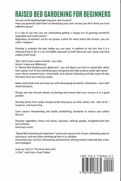 Are you contemplating beginning your own nursery?Have you generally been keen on developing your own nursery yet don't think you have sufficient space? Is it safe to say that you are anticipating getting a charge out of growing wonderful vegetables and useful plants? Regardless of whether you've not grown a plant for what seems like forever, you can make it happen! Planting is probably the best hobby you can have. In addition to the fact that it is a relaxing thing to do, it is an incredible approach to both decorate your space and have endless fresh food! "But I don't have a green thumb," you reply.Doesn't make any difference! In "Raised Bed Gardening for Beginners", you will figure out how to masterfully utilise each square inch of your planting space and guarantee high produce yields right away! In this book you will know: Learn about compartments, raised beds, and vertical cultivating and take away the tips that best serve you and your space. Make raised beds that will assist you with developing wonderful, solid plants - even with restricted space. Plunge into the intricate details of planting and ensure that your nursery is in a good position. Develop plants from seeds and guarantee they grow up solid, useful, and - best of all - nuisance- and insect-free. Learn expert interplanting and buddy establishing standards to ensure your plants flourish. Develop vegetables, herbs and spices, naturally, utilizing speedy, straightforward tips and methods. And much more! "Raised Bed Gardening for Beginners" treats each square inch of your cultivating space as sacrosanct, and each plant developing from it as valuable. Guarantee your nursery's blossoming achievement utilizing master endorsed tips, tricks, and strategies! Look up, Click on "Purchase Now with 1-Click", and Grab a Copy Today!