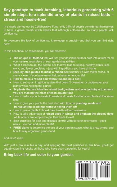 Say goodbye to back-breaking, laborious gardening with 6 simple steps to a splendid array of plants in raised beds - stress and hassle-free! There is something incredibly rewarding about a vibrant garden. Every day offers something new: a different sight, a unique scent, the buzz of curious insects, and, of course, the taste of fresh organic produce. Gardening not only nurtures your plants but also benefits your physical and mental health. It reduces stress, lowers the risk of chronic diseases, and provides an excellent opportunity for light exercise. So, what holds people back? A Collaborative Fund study found that only 34% of people consider themselves to have a green thumb. Many enthusiasts lack confidence and fear the disappointment of failed efforts after investing time and money into gardening. The solution? Knowledge-and you'll find everything you need right here! In this handbook, you'll discover why raised bed gardening is an ideal starting point for beginners. With step-by-step guidance, you'll create a thriving, abundant raised bed garden you can take pride in.Here's a glimpse of what you'll uncover:The 6P Method: Transform your outdoor area into a sensory delight, regardless of your gardening experience. Perfect Soil: Learn how to achieve healthy, low-maintenance soil using ingredients you already have at home. Raised Bed Construction: Step-by-step instructions for building raised beds with wood, metal, or stone-even if you're a complete DIY novice. Budget-Friendly Tips: Discover how to create raised beds without spending a cent. Irrigation Made Easy: Set up an efficient watering system that protects your plants while conserving water. Plant Selection: 34 ideal plants for raised beds and one proven technique to maximize every square foot. Composting Basics: Reduce household waste while creating nutrient-rich food for your plants. Seed and Seedling Tips: Master the art of planting seeds and transplanting seedlings for optimal success. Pruning Techniques: Learn how to prune effectively to promote plant health and growth. Winter Gardening: Utilize raised beds during colder months to brighten gloomy days and extend your growing season. Natural Pest Control: Tackle pests and diseases without harsh chemicals by incorporating companion plants. Garden Planning: Free plans to organize your garden space, decide what to grow where, and stay on track year-round. And so much more! Raised bed gardening isn't just for retirees with ample free time. It's perfect for busy individuals who want to spend just a few minutes a day enjoying the therapeutic benefits of gardening while achieving spectacular results.With the techniques in this book, your garden will flourish as beautifully as those of seasoned gardeners. Start your raised bed gardening journey today and enjoy the stress-free satisfaction of growing your own vibrant, thriving plants!