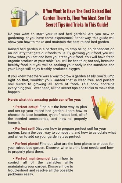 If You Want To Have The Best Raised Bed Garden There Is, Then You Must See The Secret Tips And Tricks In This Guide! Do you want to start your raised bed garden? Are you new to gardening, or you have some experience? Either way, this guide will show you how to make and maintain the best raised bed garden. Raised bed garden is a perfect way to stop being so dependent on an industry that gets our foods to us. By growing your food, you will know what you eat and how you treat your food. You will have fresh organic produce at your table. You will be healthier, not only because healthy food, but you will be soaking your body in the sunshine and your lungs will enjoy freshly produced oxygen. If you knew that there was a way to grow a garden easily, you'd jump right on that, wouldn't you? Garden that is weed-free, and perfect soil suited to growing all sorts of food? This book contains everything you'll ever need, all the secret tips and tricks to make that happen. Here's what this amazing guide can offer you:Perfect setup! Find out the best way to plan and set up your raised bed garden. Learn how to choose the best location, type of raised bed, all of the needed accessories, and how to properly fence it. Perfect soil! Discover how to prepare perfect soil for your garden. Learn the best way to compost it, and how to calculate what and when to add so your garden stays perfect. Perfect plants! Find out what are the best plants to choose for your raised bed garden. Discover what are the best seeds, and how to properly plant them. Perfect maintenance! Learn how to control all of the variables while maintaining your garden. Discover how to troubleshoot and resolve all the possible problems easily.