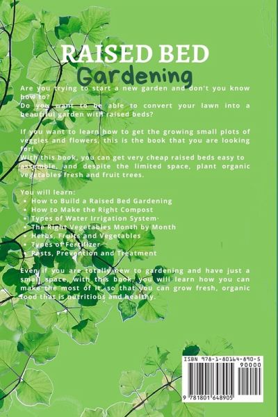 Are you trying to start a new garden and don't you know how to? Do you want to be able to convert your lawn into a beautiful garden with raised beds? If you want to learn how to get the growing small plots of veggies and flowers, this is the book that you are looking for! With this book, you can get very cheap raised beds easy to assemble, and despite the limited space, plant organic vegetables fresh, and fruit trees. You will learn: How to Build a Raised Bed Gardening How to Make the Right Compost Types of Water Irrigation System The Right Vegetables Month by Month Herbs, Fruits, and Vegetables Types of Fertilizer Pests, Prevention, and Treatment Even if you are totally new to gardening and have just a small space, with this book, you will learn how you can make the most of it, so that you can grow fresh, organic food that is nutritious and healthy. What are you waiting for? Take this book NOW!