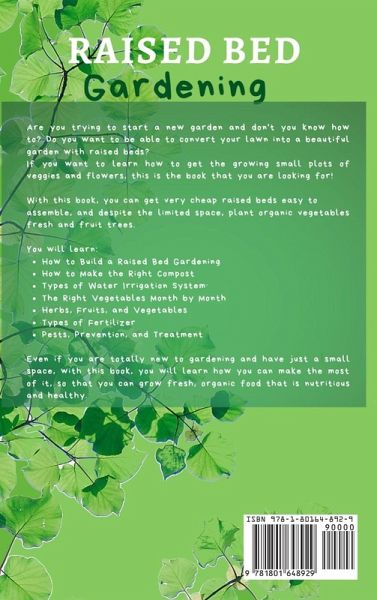 Are you trying to start a new garden and don't you know how to? Do you want to be able to convert your lawn into a beautiful garden with raised beds? If you want to learn how to get the growing small plots of veggies and flowers, this is the book that you are looking for! With this book, you can get very cheap raised beds easy to assemble, and despite the limited space, plant organic vegetables fresh, and fruit trees. You will learn: How to Build a Raised Bed Gardening How to Make the Right Compost Types of Water Irrigation System The Right Vegetables Month by Month Herbs, Fruits, and…mehr