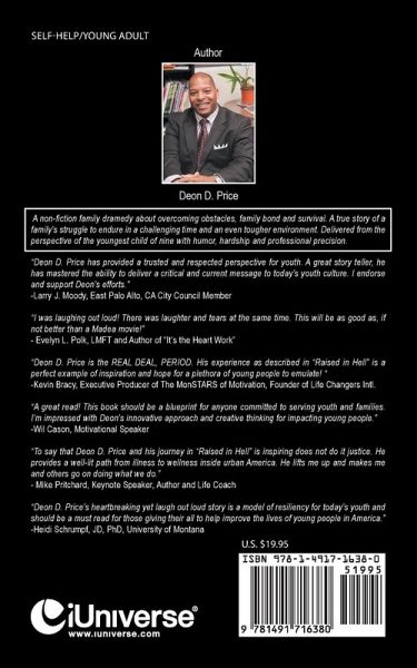 A non-fiction family dramedy about overcoming obstacles, family bond and survival. A true story of a family's struggle to endure in a challenging time and an even tougher environment. Delivered from the perspective of the youngest child of nine with humor, hardship and professional precision. "Deon D. Price has provided a trusted and respected perspective for youth. A great story teller, he has mastered the ability to deliver a critical and current message to today's youth culture. I endorse and support Deon's efforts." -Larry J. Moody, East Palo Alto, CA City Council Member "I was laughing out loud! There was laughter and tears at the same time. This will be as good as, if not better than a Madea movie!" - Evelyn L. Polk, LMFT and Author of "It's the Heart Work" "Deon D. Price is the REAL DEAL, PERIOD. His experience as described in "Raised in Hell" is a perfect example of inspiration and hope for a plethora of young people to emulate! " -Kevin Bracy, Executive Producer of The MonSTARS of Motivation, Founder of Life Changers Intl. "A great read! This book should be a blueprint for anyone committed to serving youth and families. I'm impressed with Deon's innovative approach and creative thinking for impacting young people." -Wil Cason, Motivational Speaker "To say that Deon D. Price and his journey in "Raised in Hell" is inspiring does not do it justice. He provides a well-lit path from illness to wellness inside urban America. He lifts me up and makes me and others go on doing what we do." - Mike Pritchard, Keynote Speaker, Author and Life Coach "Deon D. Price's heartbreaking yet laugh out loud story is a model of resiliency for today's youth and should be a must read for those giving their all to help improve the lives of young people in America." -Heidi Schrumpf, JD, PhD, University of Montana