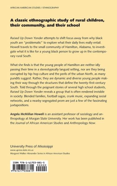 Raised Up Down Yonder attempts to shift focus away from why black youth are "problematic" to explore what their daily lives actually entail. Howell travels to the small community of Hamilton, Alabama, to investigate what it is like for a young black person to grow up in the contemporary rural South. What she finds is that the young people of Hamilton are neither idly passing their time in a stereotypically languid setting, nor are they being corrupted by hip hop culture and the perils of the urban north, as many pundits suggest. Rather, they are dynamic and diverse young people making their way through the structures that define the twenty-first-century South. Told through the poignant stories of several high school students, Raised Up Down Yonder reveals a group that is often rendered invisible in society. Blended families, football sagas, crunk music, expanding social networks, and a nearby segregated prom are just a few of the fascinating juxtapositions. Howell uses personal biography, historical accounts, sociolinguistic analysis, and community narratives to illustrate persistent racism, class divisions, and resistance in a new context. She addresses contemporary issues, such as moral panics regarding the future of youth in America and educational policies that may be well meaning but are ultimately misguided. Angela Mcmillan Howell, Baltimore, Maryland, is an assistant professor of sociology and anthropology at Morgan State University. Her work has been published in the Journal of African American Studies and Anthropology Now.