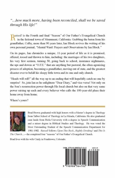 Raised! is the Fourth and final "Season" of Our Father's Evangelical Church in the fictional town of Monument, California. Grabbing the baton from his grandfather, Colby, more than 90 years later, Ian Block revives the writing of his own personal journal, "Mental Ward: Prayers and Observations by Ian Block." On its pages, Ian chronicles a unique, 11-year period of life as it is promised, offered, tossed and thrown to him, including: the marriages of his two daughters, his very first sermon, turning 50, going back to school, insurance nightmares, the ups and downs at "O.F.E." that are anything but pastoral, the often-agonizing process of adoption, becoming a grandfather, moving out of state, and the greatest disaster ever to befall his sleepy little town and its one and only church. "Heads will roll!" all the way up to an ending that will hopefully catch no one by surprise! So, join Ian as he enlightens "Dear Diary," and vice-versa! Not only on the Son's resurrection power through His local church but also on that very same power raising up each and every believer who calls the 100-year-old place their home away from home. Where's yours?