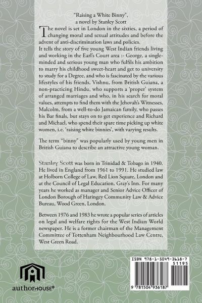 "Raising a White Binny", a novel by Stanley Scott The novel is set in London in the sixties, a period of changing moral and sexual attitudes and before the advent of anti-discrimination laws and policies. It tells the story of five young West Indian friends living and working in the Earl's Court area :- George, a single-minded and serious young man who fulfils his ambition to marry his childhood sweet-heart and get to university to study for a Degree, and who is fascinated by the various lifestyles of his friends, Vishnu, from British Guiana, a non-practicing Hindu, who supports a 'proper' system of arranged marriages and who, in his search for moral values, attempts to find them with the Jehovah's Witnesses, Malcolm, from a well-to-do Jamaican family, who passes his Bar finals, but stays on to get experience and Richard and Michael, who spend their spare time picking up white women, i.e. 'raising white binnies', with varying results. The term "binny" was popularly used by young men in British Guiana to describe an attractive young woman.