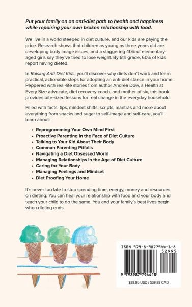 Too much time feeling obsessed with food and unable to find peace and freedom around food, much less your body? Worried that you'll pass on your quirky food habits and food and body shame to your growing child? This book is for you. Raising Anti-Diet Kids is your guide to understanding why negative habits begin around food, how to change your behaviors, the best way to talk with your kids about meals, snacks, sugar, their body and so much more. You'll finally be able to feel like you and your child can relax around food and appreciate your bodies. Inside this book, you'll learn why diets don't work, how to ditch diets for good, how to navigate our diet-obsessed world, how to avoid common parenting pitfalls when it comes to talking with kids about food and body, how to be a proactive parent in the face of diet culture, and the best ways to reconnect with and care for your body and mind. It's never too late to stop spending time, energy, money, and resources on dieting. You can repair your own relationship with food and your body and teach your child to do the same. I promise you are not broken and don't need more willpower or control. Your best life really does begin when dieting ends. It's time to give yourself and your child this invaluable gift.