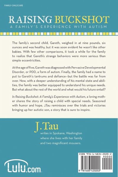 The family's second child, Gareth, weighed in at nine pounds, six ounces and was healthy, but it was soon evident he wasn't like other babies. With few other comparisons, it took a while for the family to realize that Gareth's strange behaviors were more serious than simple eccentricities. At the age of five, Gareth was diagnosed with Pervasive Developmental Disorder, or PDD, a form of autism. Finally, the family had a name to put to Gareth's tantrums and defiance-but the battle was far from over. Now, with a deeper understanding of his mental state and abilities, the family was better equipped to understand his unique needs. But what about the rest of the world and what would his future entail? In Raising Buckshot: A Family's Experience with Autism, a loving mother shares the story of raising a child with special needs. Seasoned with humor and hope, J.Tau reminisces over the trials and victories bringing up her autistic son, a story that is sure to inspire.