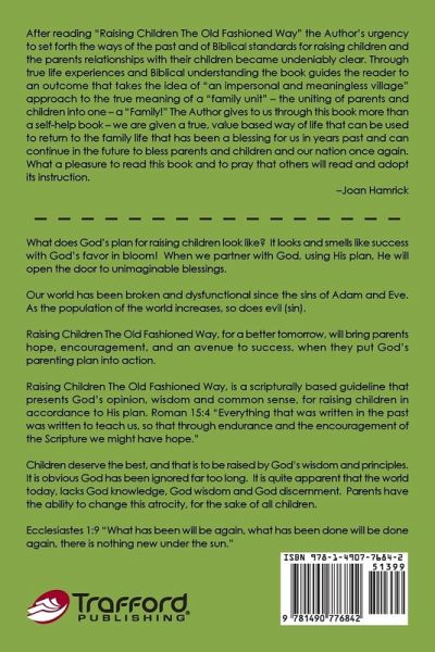 What does God’s plan for raising children look like? It looks and smells like success with God’s favor in bloom! When we partner with God, using His plan, He will open the door to unimaginable blessings. Our world has been broken and dysfunctional since the sins of Adam and Eve. As the population of the world increases, so does evil (sin). Raising Children The Old Fashioned Way, for a better tomorrow, will bring parents hope, encouragement, and an avenue to success, when they put God’s parenting plan into action. Raising Children The Old Fashioned Way, is a scripturally based guideline that presents God’s opinion, wisdom and common sense, for raising children in accordance to His plan. Roman 15:4 "Everything that was written in the past was written to teach us, so that through endurance and the encouragement of the Scripture we might have hope." Children deserve the best, and that is to be raised by God’s wisdom and principles. It is obvious God has been ignored far too long. It is quite apparent that the world today, lacks God knowledge, God wisdom and God discernment. Parents have the ability to change this atrocity, for the sake of all children. Ecclesiastes 1:9 "What has been will be again, what has been done will be done again, there is nothing new under the sun."