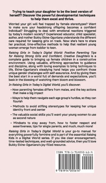 Trying to teach your daughter to be the best version of herself? Discover the powerful developmental techniques to help them excel and thrive. Worried your girl will feel trapped by female stereotypes? Want to make sure your headstrong offspring becomes a confident individual? Struggling to deal with emotional reactions triggered by today's modern society? Experienced educator, child specialist, author, and mother Bukky Ekine-Ogunlana understands the different care required for keeping girls on track. Now she's here to share her practical, time-effective methods to help that resilient young woman emerge from toddler to teen. Raising Girls in Today's Digital World: Positive Parenting Tips for Raising Strong Girls and Confident, Creative Daughters is a complete guide to bringing up female children in a constructive environment. Using valuable, affirming approaches to guidance and discipline, along with loving examples to bring techniques to life, Ekine-Ogunlana's steadying hand helps you confront those unique gender challenges with self-assurance. And by giving them the best start in a world full of demands and expectations, you'll bask in the blessing of watching them bloom and blossom. In Raising Girls in Today's Digital World, you'll discover: - How parenting females differs from males, and the key actions that make a big impact - Ways to help them navigate each age group's hurdles, so they can flourish - Methods to avoid stifling stereotypes for keeping her unique identity front and center - The valuable social skills you'll want your young women to use as second nature - Mindsets to stay away from, how to foster respect and assertiveness, tips for single parents, and much, much more! Raising Girls in Today's Digital World is your go-to manual for everything powerfully feminine and is part of the essential Raising Kids in a Digital World series. If you like clear encouragement, time-tested techniques, and well-grounded advice, then you'll love Bukky Ekine-Ogunlana's joy-filled resource. Buy Raising Girls in Today's Digital World to tap into rewarding instruction now!