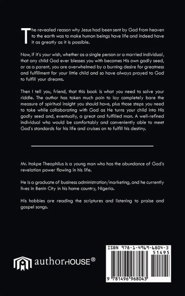 The revealed reason why Jesus had been sent by God from heaven to the earth was to make human beings have life and indeed have it as greatly as it is possible. Now, if it's your wish, whether as a single person or a married individual, that any child God ever blesses you with becomes His own godly seed, or as a parent, you are overwhelmed by a burning desire for greatness and fulfillment for your little child and so have always prayed to God to fulfill your dreams. Then I tell you, friend, that this book is what you need to solve your riddle. The author has taken much pain to lay completely bare the measure of spiritual insight you should have, plus those steps you need to take while collaborating with God as He turns your child into His godly seed and, eventually, a great and fulfilled man. A well-refined individual who would be comfortably and conveniently able to meet God's standards for his life and cruises on to fulfill his destiny.