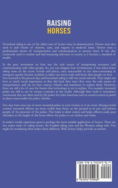 If you want to learn how to raise horses, then keep reading... Have you always dreamed of having a horse? Well, owning a horse is one thing that you'd think was simple - until you take a closer look. Raising a horse raising isn't a job for the lazy. But as you will see in this book, it is way simpler than you might have thought! This book breaks it down to the basics and provides you with everything you need to know about how to raise and train strong, healthy horses for racing, companionship, showmanship, and any other reason you can think of. Here's what you will discover... The reason ancient horses were domesticated and why we still keep horses today. How to choose the best breed for your needs. How to prepare for a new horse. How to handle and bond with you horse. The kinds and components of horse housing and how to get started with building your own. The basics of horse care, including nutrition, health, and grooming. Tips on how to take care of your horse and keep him happy. The reproduction in horses and the basics of horse breeding. How to manage horse foaling, foal care, and how to wean your foal at the proper time. Master the art of basic horse training. Discover how to train your horse advanced show tricks and athletic training. This book is the all-inclusive guide you need on your journey to learn how to raise horses. The powerful secrets in this book will take you from being a novice to an expert horse owner quickly. Using plain language and without complicated jargon, you will learn amazing new things you probably never knew about horses. Get this book now and get started on your journey to becoming an adept horse owner.