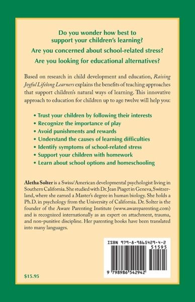 This book is primarily for parents but is also of interest to teachers. It explains the benefits of teaching approaches that support children's natural ways of learning through age twelve. Parents will learn strategies to use at home to support their children's education. Topics include trusting children by following their interests, recognizing the importance of play, providing appropriate stimulation, avoiding punishments and rewards, understanding the causes of learning difficulties, identifying symptoms of school-related stress, and supporting children with homework. The author, a Swiss/American developmental psychologist who studied with Piaget, describes his constructivist learning theory and its educational implications, specifically, the benefits of learning by discovery rather than through direct instruction. The underlying assumption is that children are born with an innate desire and ability to learn and can be trusted to learn at their own pace and in their own way. As part of the author's Aware Parenting approach, this book offers a non-punitive, attachment-based, and trauma-informed approach to education. She proposes twelve fundamental principles of learning that align with children's natural learning processes. Supported by research, these principles apply to all children. Educational approaches that honor these principles foster deep, meaningful learning without relying on punishments or rewards. Teaching methods that deviate from these principles can hinder children's motivation and ability to learn. Numerous real-life examples of both effective and ineffective teaching approaches are used to illustrate the concepts. An important chapter describes how stress can interfere with children's ability to learn. Another focuses on ways that parents can offer emotional support at home to help children cope with school-related stress and homework. A chapter on learning difficulties describes both biological and psychological factors that can lead to attention problems, school resistance, and behavior problems. The book also includes a brief history of schools and educational reformers, as well as an overview of educational options, including homeschooling. The final chapter explains the importance of raising children to be lifelong learners with high motivation and confidence to continue learning joyfully as adults. Based on studies in child development, learning theory, and educational psychology, this is a well-researched book with numerous scientific references. Charts scattered throughout the text provide handy summaries of key points, and a series of exercises invites parents to reflect on their own childhood learning experiences. Additional features include a useful glossary of terms and a short description of major educational reformers.