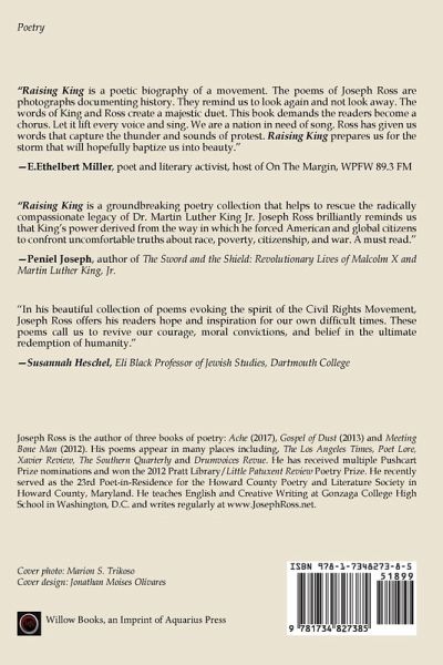 Poetry collection on the life and legacy of Dr. Martin Luther King, Jr. by Joseph Ross. "raising king urges readers to walk beside Dr. Martin Luther King, Jr. from Montgomery to Memphis, past police dogs, mobs, and fire hoses. Listen to his thoughts, hopes, and fears. You'll also hear from heroes including Abernathy, Shuttlesworth, and Coretta Scott King." --the Author Ross is the 23rd Poet-in-Residence for the Howard County Poetry and Literature Society in Howard County, Maryland. He teaches English and Creative Writing at Gonzaga College High School in Washington, D.C.